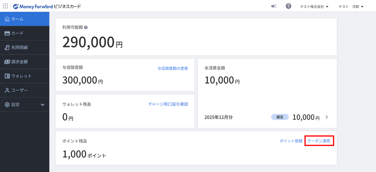 クーポンの適用は、Web版のマネーフォワード ビジネスカードを「管理者」ロールで利用中のユーザーのみ可能です。