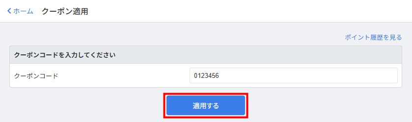 - 「クーポン適用」画面でクーポンコードを入力し、「適用する」をクリックします。