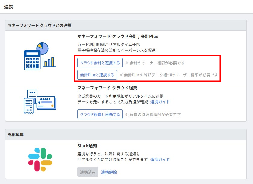 マネーフォワード ビジネスカードと会計サービスを連携するためには、会計サービスの以下ユーザーがビジネスカードに登録されている必要があります。