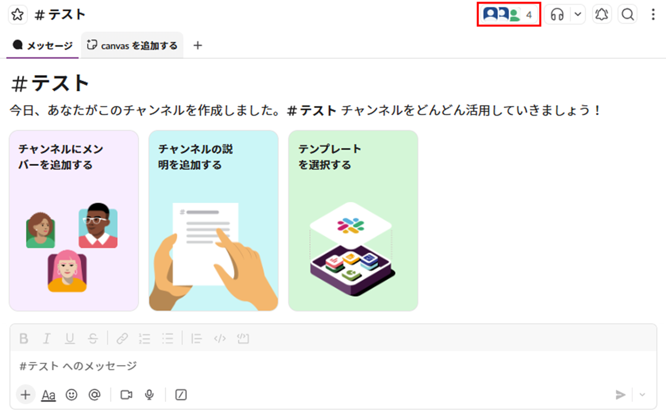 - 通知を受信する「Slackチャンネル」を開き、右上にある人型のアイコンをクリックします。