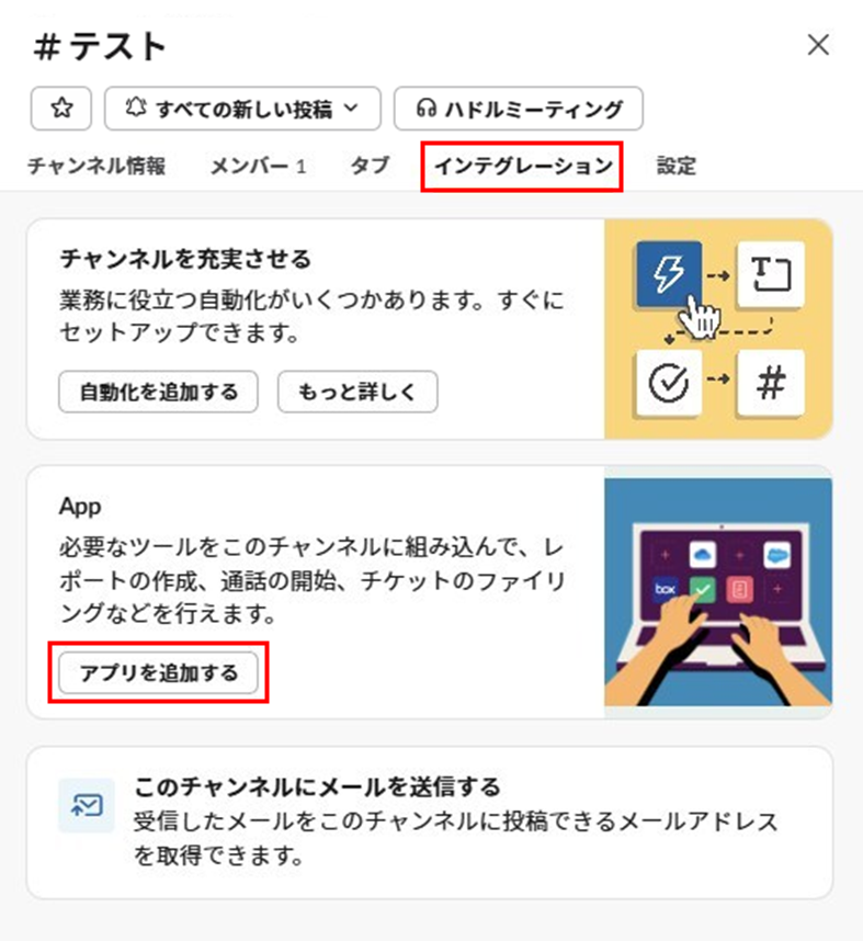 - 「インテグレーション」タブを選択し、「アプリを追加する」をクリックします。