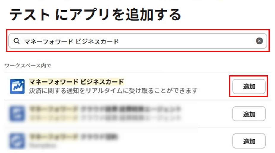 - 検索ボックスに「マネーフォワード ビジネスカード」と入力し、「追加」をクリックします。