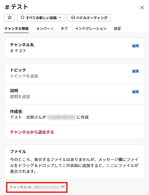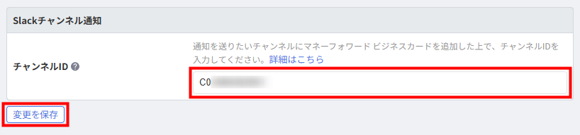 - 「カード詳細」画面で「Slackチャンネル通知」の「チャンネルID」にコピーしたIDを貼り付け、「変更を保存」をクリックします。