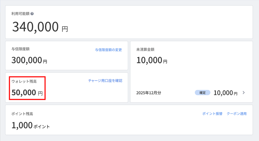 - 「ホーム」画面にある「ウォレット残高」で残高を確認します。