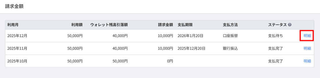 - 「請求金額」画面で請求明細を確認する月の「明細」をクリックします。