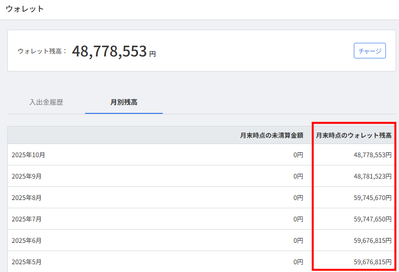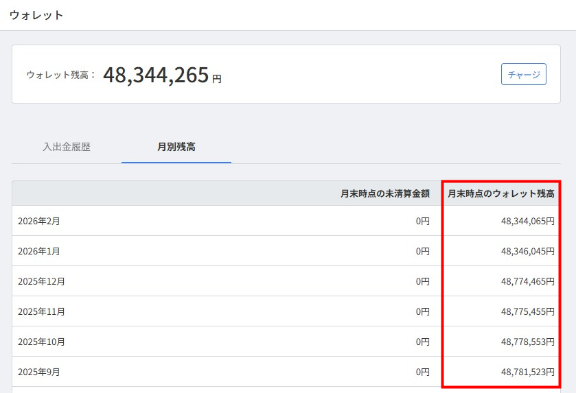 前月の月末時点のウォレット残高 + 当月の入金合計 – 出金合計 = 当月月末時点のウォレット残高