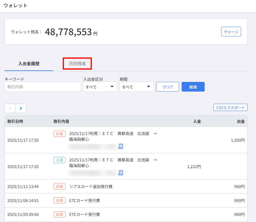 - 「ウォレット」画面で「月別残高」をクリックします。