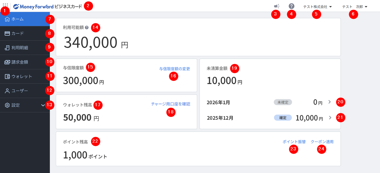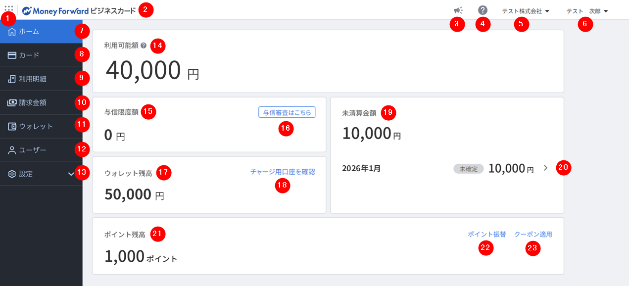 | ⑬ | 「設定」メニュー | クリックすると、「事業者」「通知」「与信限度額」「カード送付先」「連携」メニューが表示されます。 各メニューをクリックすると画面が切り替わり、各種設定が可能です。 |