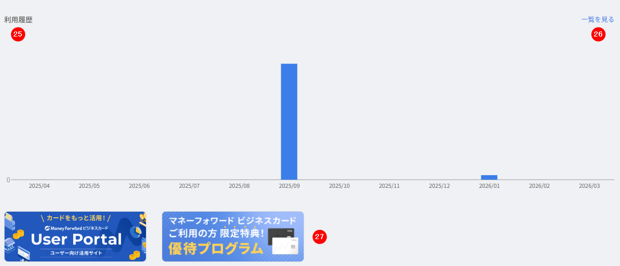 | ㉕ | 利用履歴 | 利用履歴が縦棒グラフで表示されます。 |