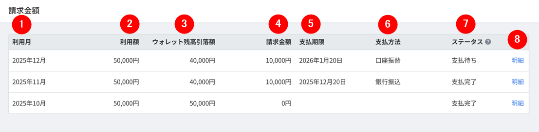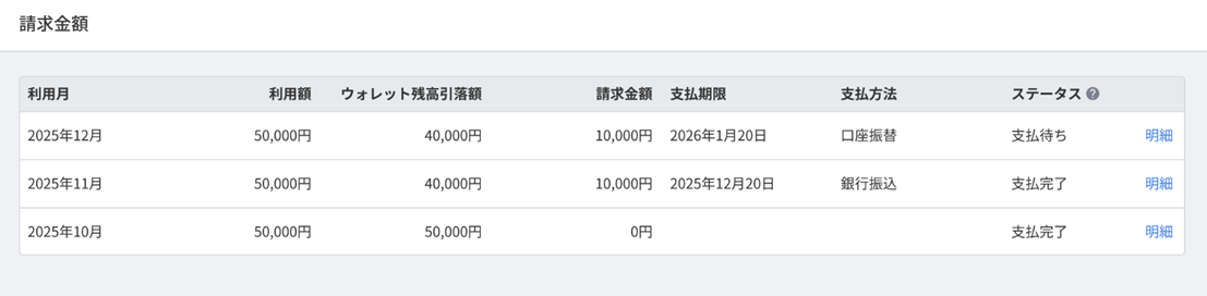 「請求金額」画面では、各月の「利用額」「ウォレット残高引落額」「請求金額」「支払期限」「支払方法」「ステータス」を確認できます。