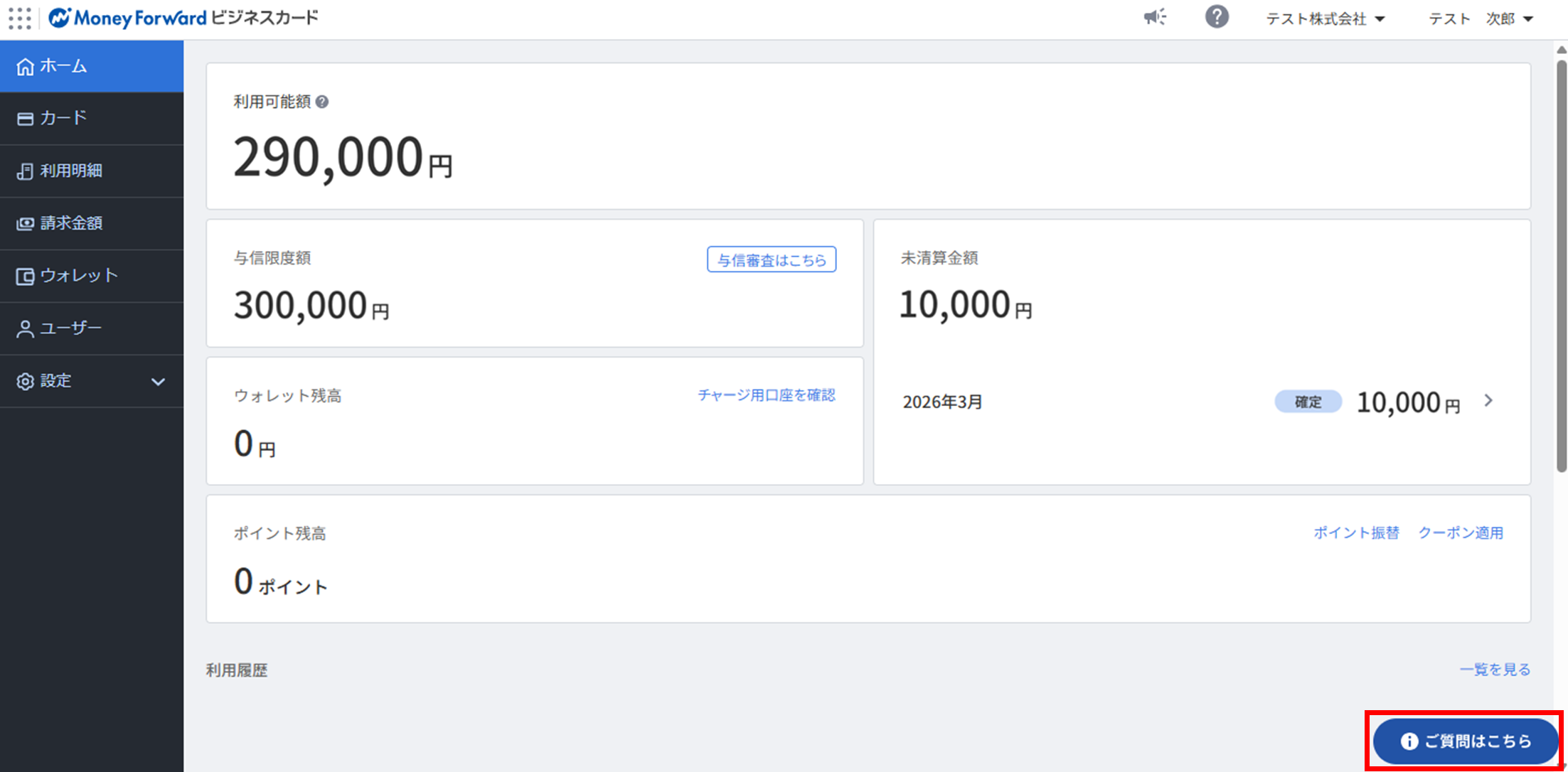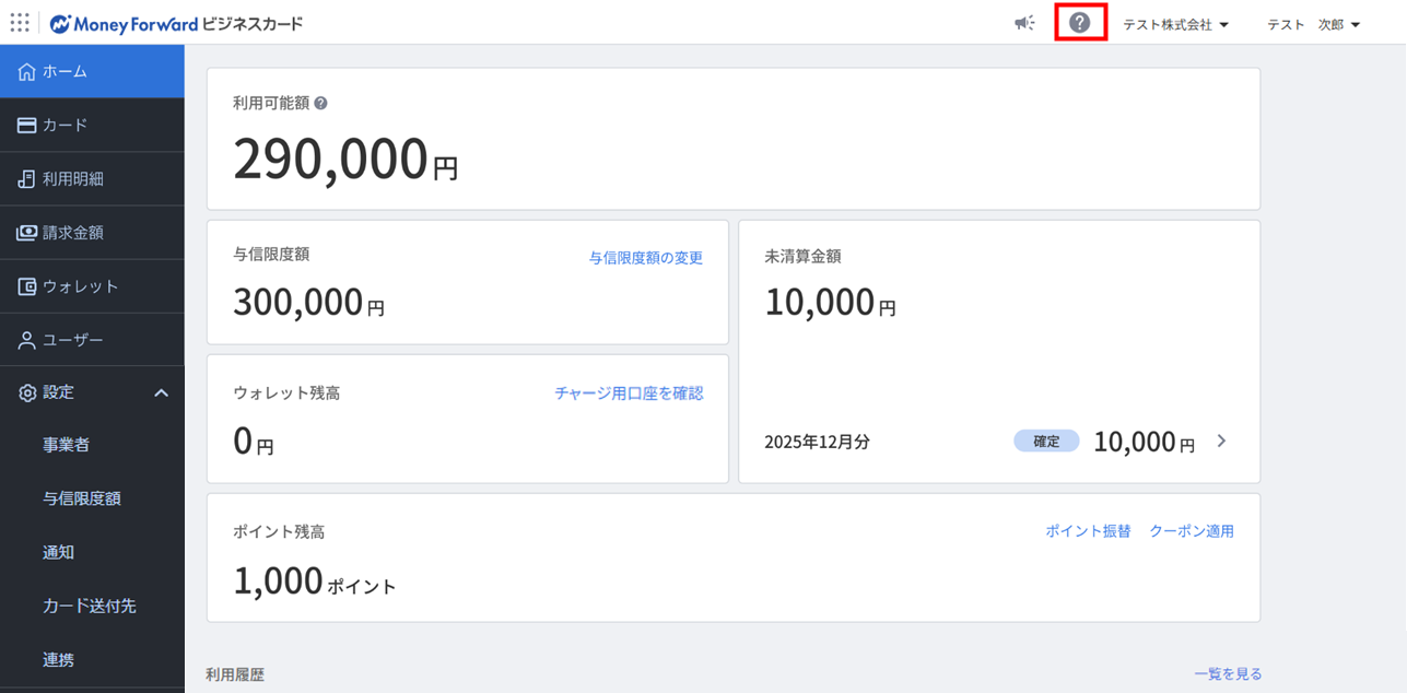 - マネーフォワード ビジネスカードにログインし、サービス画面の右上にある「?」のアイコンをクリックします。