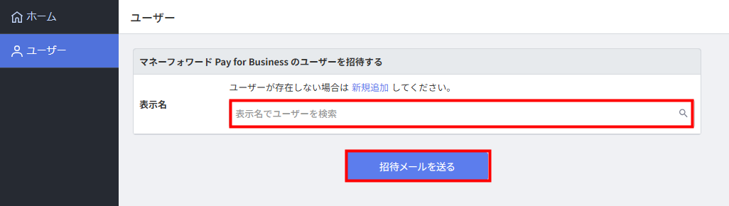 - 「ユーザー」画面の検索ボックスに検索に招待するユーザーの表示名を入力し、「招待メールを送る」をクリックします。