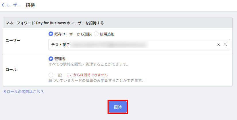 - マネーフォワード Pay for Businessに招待されたユーザーは、管理者としてカード暗証番号を含むすべてのカード情報や利用明細を確認できるようになります。そのため、招待するユーザーは慎重にご検討ください。