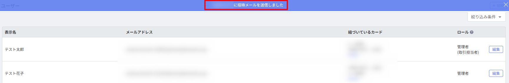- 画面上部に「招待メールを送信しました」というメッセージが表示されたことを確認します。
