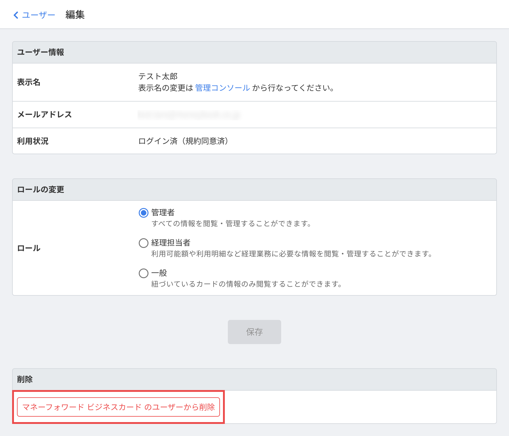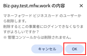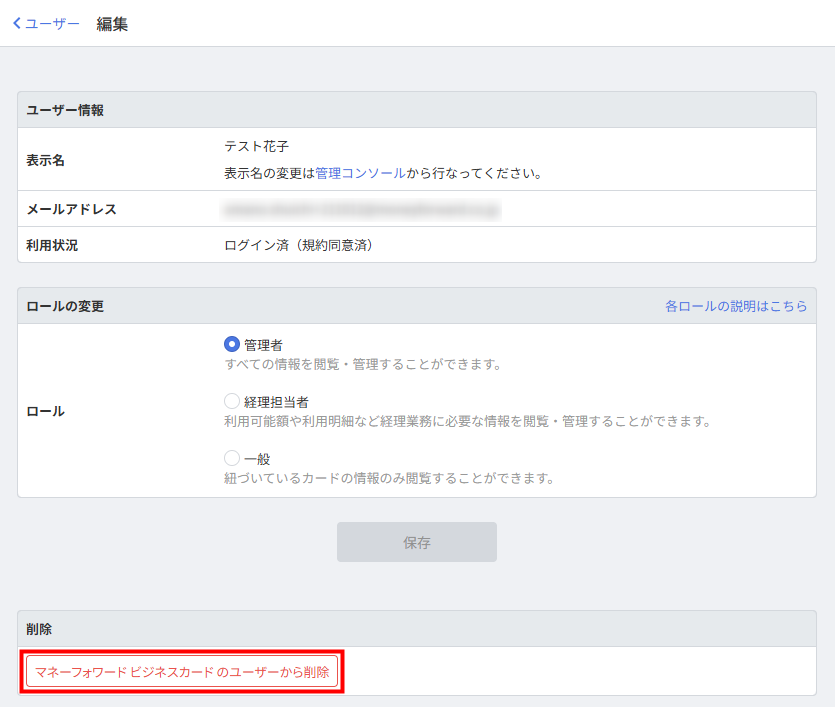 - 「編集」画面で「マネーフォワード ビジネスカード のユーザーから削除」をクリックします。