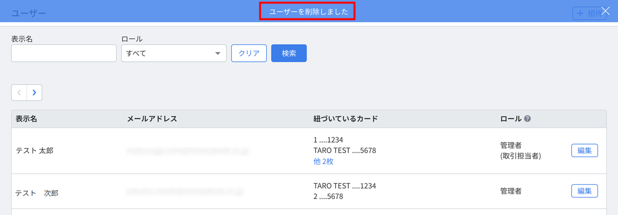- 「ユーザー」画面上部に「ユーザーを削除しました」というメッセージが表示されたことを確認します。
