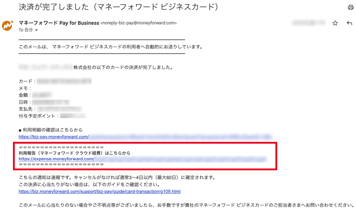 「マネーフォワード クラウド経費」でコーポレートカード連携をご利用の事業者において、「マネーフォワード ビジネスカード」の利用時に送信される決済完了通知にクラウド経費で利用報告を行うためのURLを追加しました。