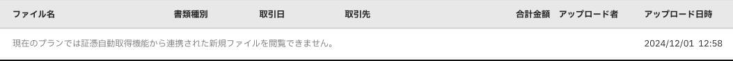 | 2 | 現在のプランでは証憑自動取得機能から連携された新規ファイルを閲覧できません。 | ご契約状況によりクラウドBoxへのアップロードに制限がかかっている状態で、「証憑自動取得」機能によって連携されたファイルが存在する場合に表示されます。 いずれかの有償プランの契約やアップグレードを行い、クラウドBoxにファイルをアップロードできる状態にしてください。 | |