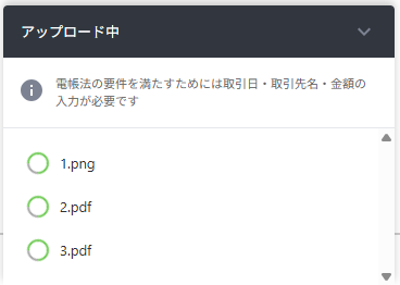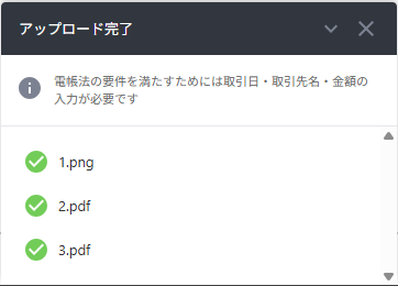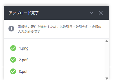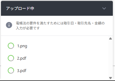 7. 画面の左下に「アップロード中」と「電帳法の要件を満たすためには取引日・取引先名・金額の入力が必要です」が表示されたことを確認します。