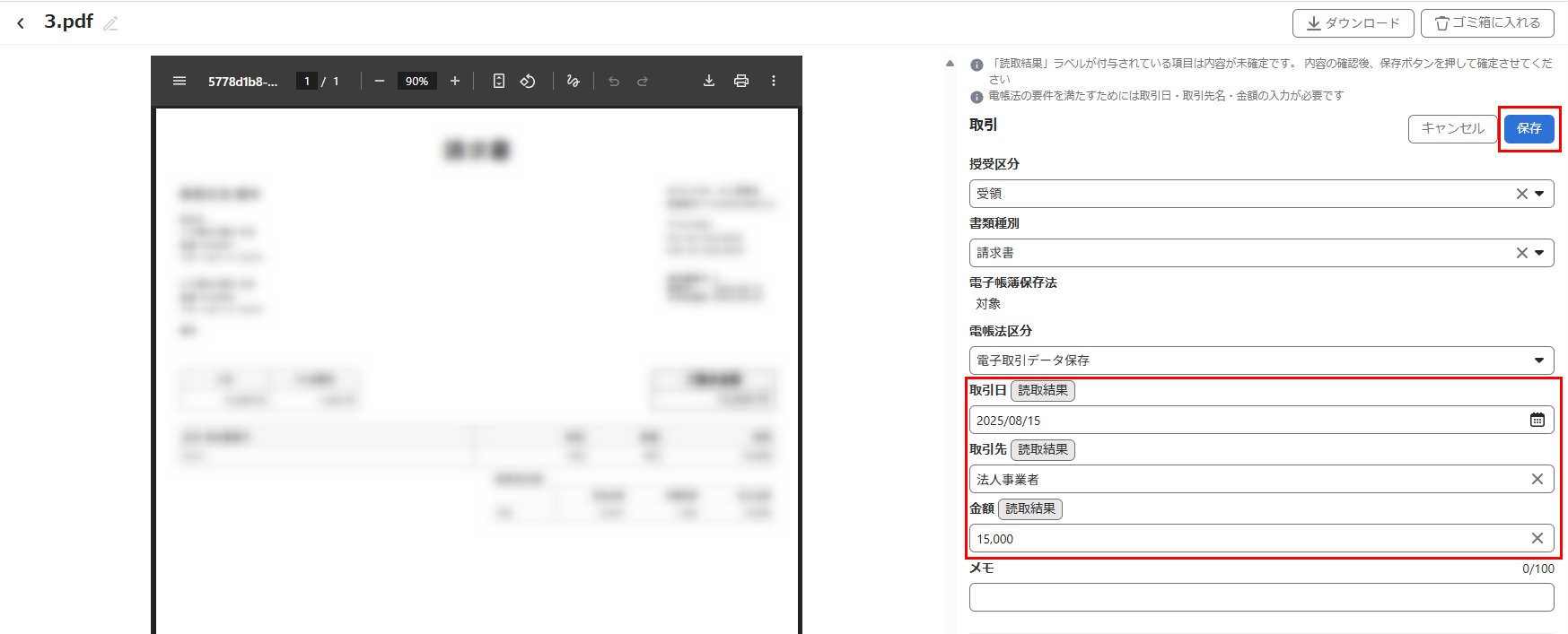 10. 読み取り結果を確認・修正し、「保存」をクリックします。