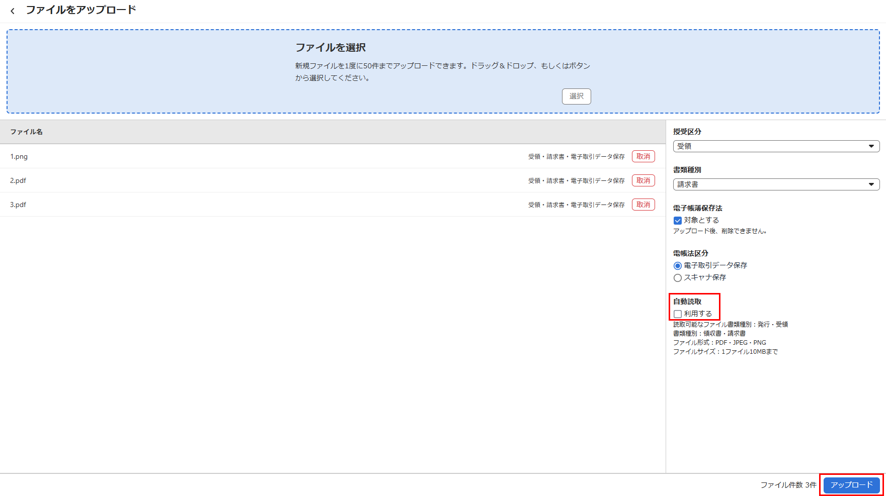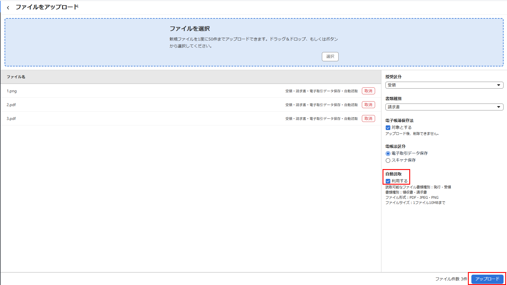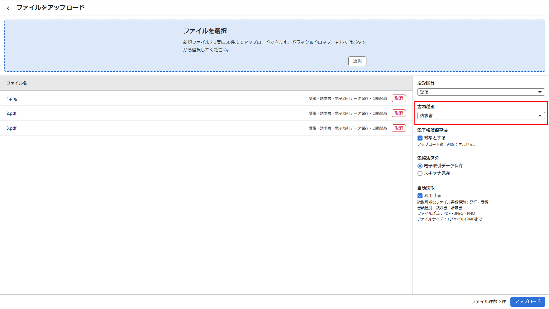 • 読み取り可能なファイルは、「書類種別」が「領収書」または「請求書」のファイルのみです。