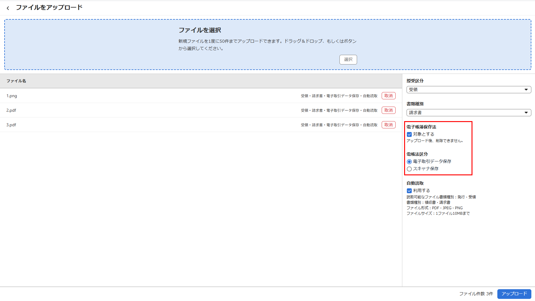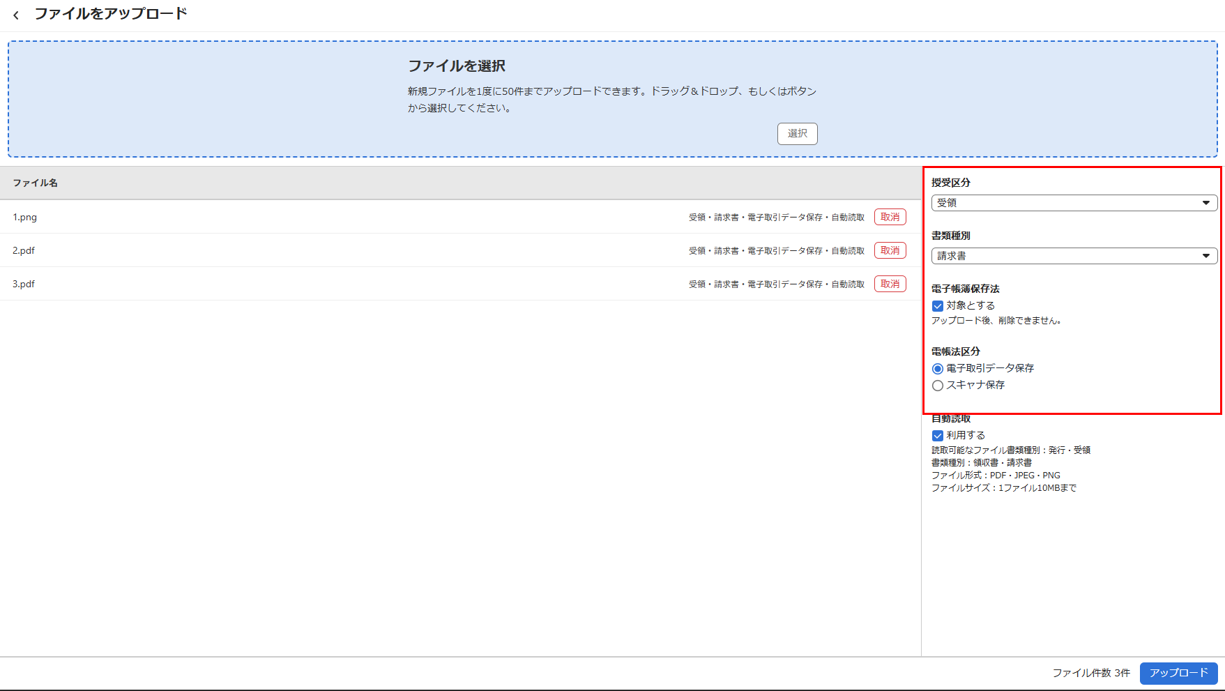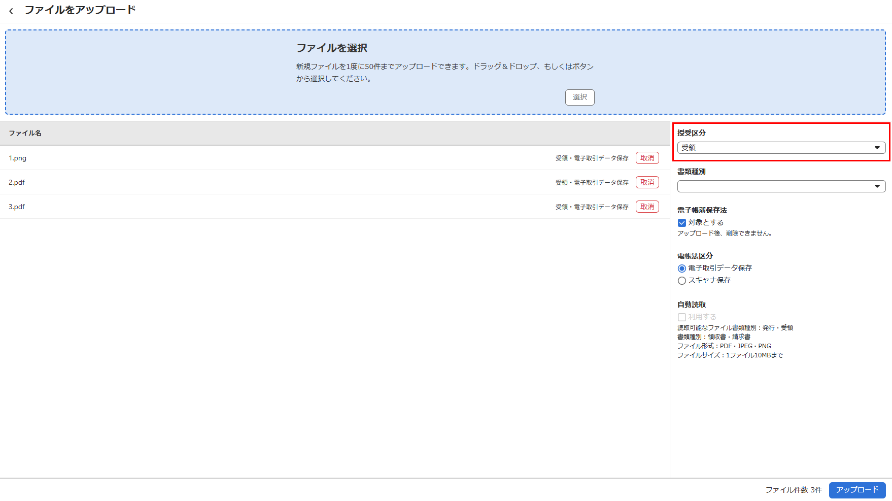 • 読み取り可能なファイルは、「書類種別」が「領収書」または「請求書」のファイルのみです。