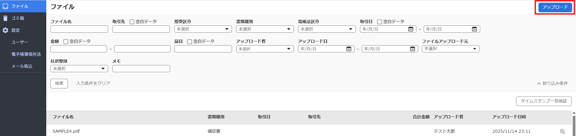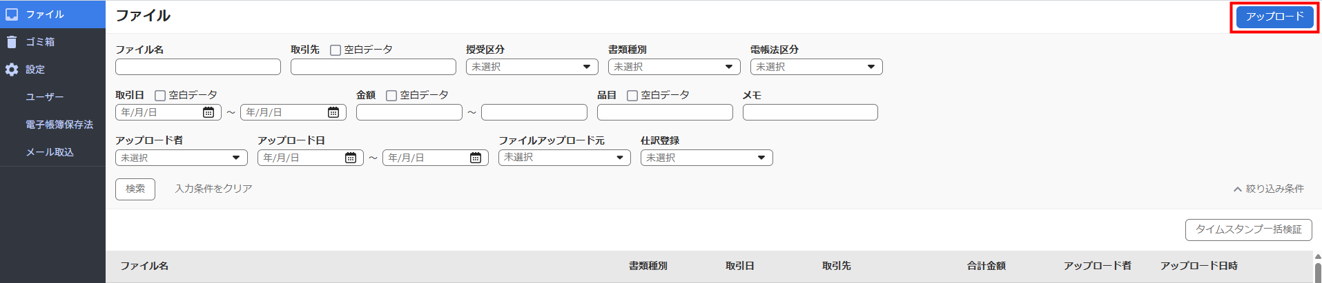 「スキャナ保存区分」に該当するファイルをアップロードするためには、事前設定が必要です。