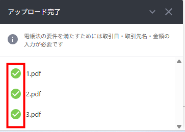 5 | アップロードに失敗した可能性があります。ファイル一覧を確認してください。 | ファイルをアップロードできなかった可能性があります。 「ファイル」画面で一覧を確認し、表示されていないファイルは再度アップロードしてください。 |