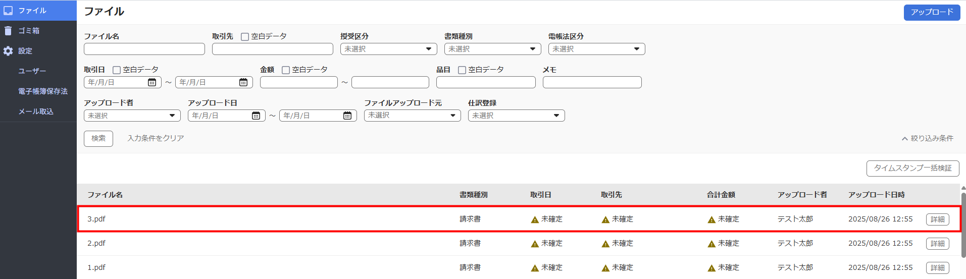 - 「ファイル」画面で「取引日」「取引先名」「金額」に「未確定」と表示されているファイルを選択します。