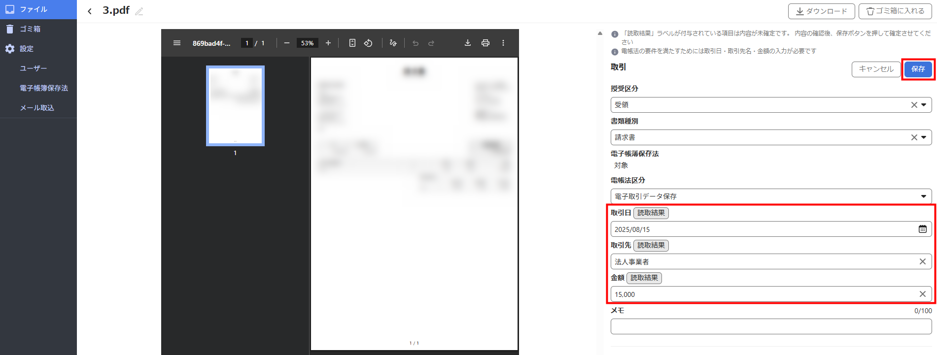 - 読み取り結果を確認・修正し、「保存」をクリックします。
