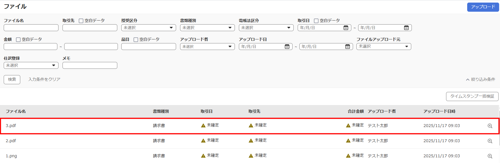 9. ファイル」画面で「取引日」「取引先名」「金額」に「未確定」と表示されているファイルを選択します。