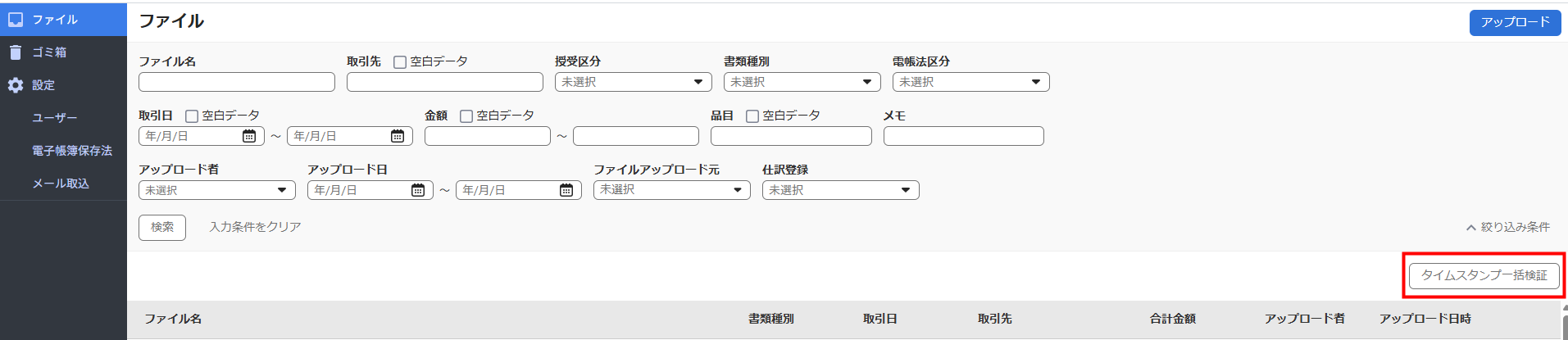 - 「ファイル」画面上部で条件を指定して検索したあとに「タイムスタンプ一括検証」をクリックすると、検索後のファイルが一括検証の対象となります。