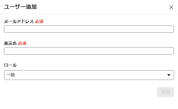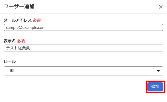- 「メールアドレス」と「表示名」を入力し、「ロール」のプルダウンから設定するロールを選択します。
