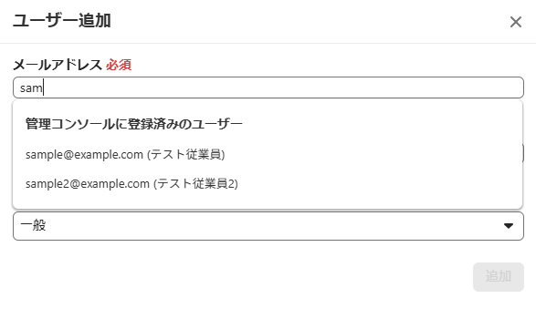 - ユーザーの候補は、入力した2字以上の文字列が管理コンソールに登録されているメールアドレスと部分一致する場合に表示されます。