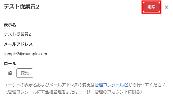 - ユーザーの詳細画面で「削除」ボタンをクリックします。