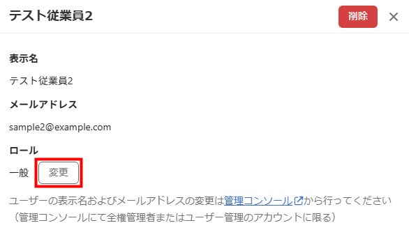 - ユーザーの詳細画面で「ロール」の「変更」ボタンをクリックします。