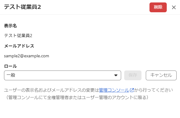 - 「ユーザー」画面では、表示名やメールアドレスを変更できません。ユーザー名を変更する場合は、「マネーフォワード クラウドの管理コンソール」の「ユーザー」画面で操作してください。メールアドレスは「メールアドレス変更」画面で変更してください。