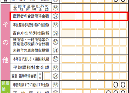 申告書第一表「(57)配偶者の合計所得金額」と申告書第二表「(20)~(24)、(35)、(40)配偶者や親族に関する事項」には、配偶者特別控除を受ける場合に、配偶者の合計所得金額が反映します。