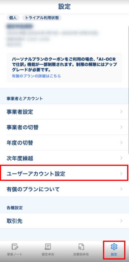 - 「設定」画面で「ユーザーアカウント設定」 をタップします。