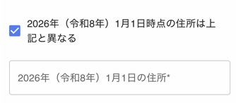 1月2日以降に引っ越しなどによって住所が変更になった場合は、「2026年(令和8年)1月1日時点の住所は上記と異なる」にチェックを入れ、1月1日時点まで居住していた住所を入力します。