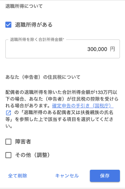 「退職所得について」では、配偶者が退職所得を受け取っている場合に、「退職所得がある」にチェックを入れて「退職所得を除く合計所得金額」を入力します。