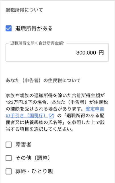 「退職所得について」では、家族や親族が退職所得を受け取っている場合に、「退職所得がある」にチェックを入れて「退職所得を除く合計所得金額」を入力します。