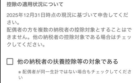 「控除の適用状況について」では、申告者以外が配偶者の扶養控除を受けている場合に、「他の納税者の扶養控除の対象である」にチェックを入れます。