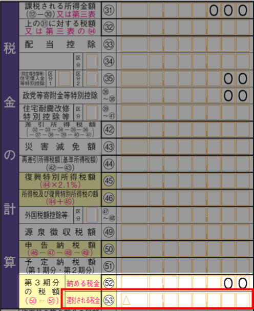 還付があるかについては、確定申告書第一表の「(53)第3期分の税額 – 還付される税金」をご確認ください。