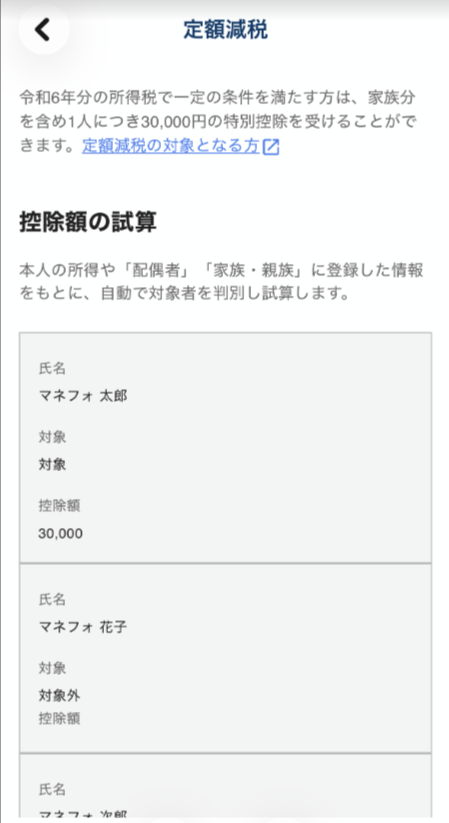 クラウド確定申告アプリでは、「家族や親族」画面に入力した情報をもとに、対象者の判定や金額の算出が行われます。