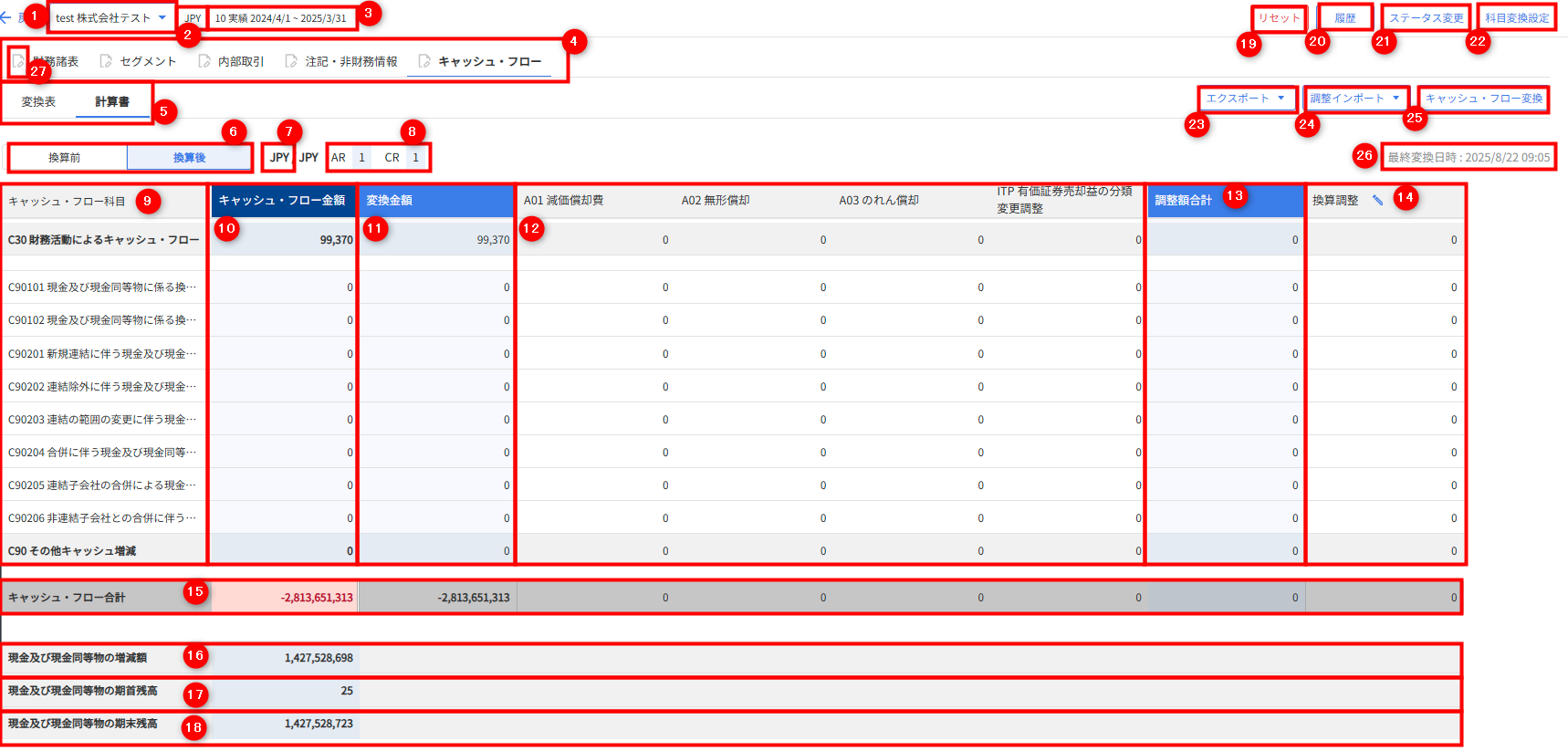 | ⑲ | リセット | クリックすると、対象の会社で入力したキャッシュ・フロー変換表、キャッシュ・フロー調整、換算調整等を削除できます。 詳細はこちらのガイドをご参照ください。 |