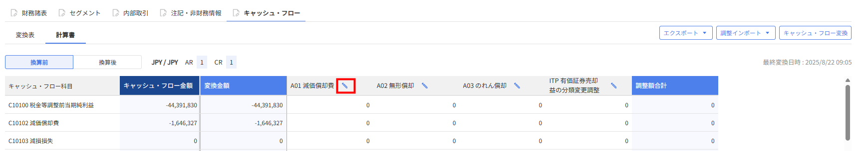 | ⑫ | 調整種別 | 「調整種別」画面で登録した調整種別が表示されます。 「換算前」画面で調整種別名の横に表示される鉛筆のアイコンをクリックすると、キャッシュ・フロー調整が行えます。 詳細はこちらの項をご参照ください。 |