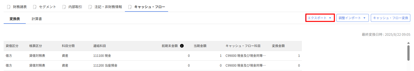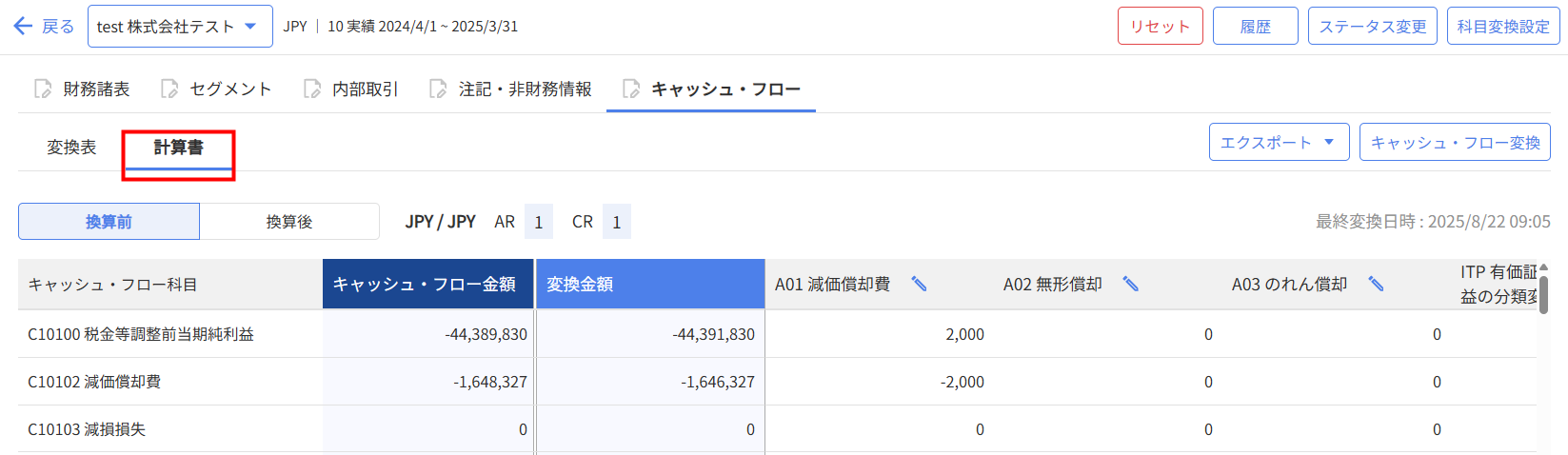 - 「計算書_換算前」「計算書_換算後」「キャッシュ・フロー調整」のいずれかを選択します。
