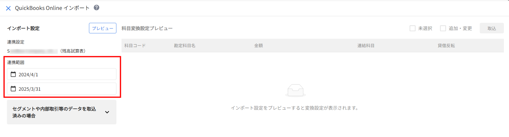 「QuickBooks Online」を選択した場合は、「連携範囲」を設定します。