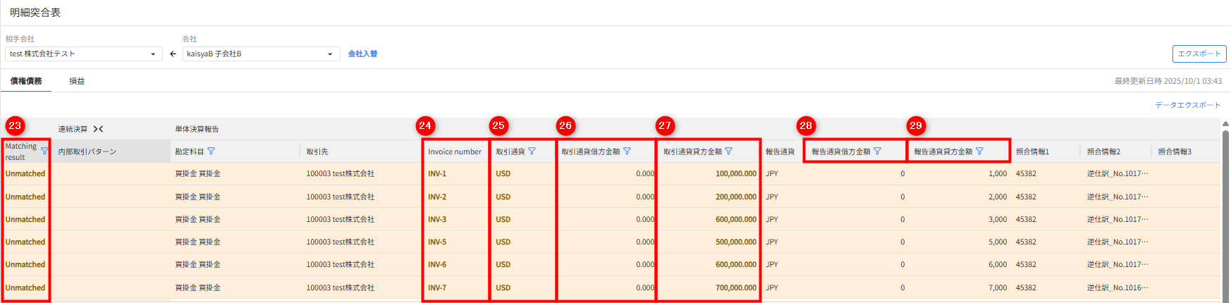 | Unmatched | 「会社」と「相手会社」の両方にInvoice numberが入力されているにもかかわらず、取引通貨金額の合計が一致しない状態。 |